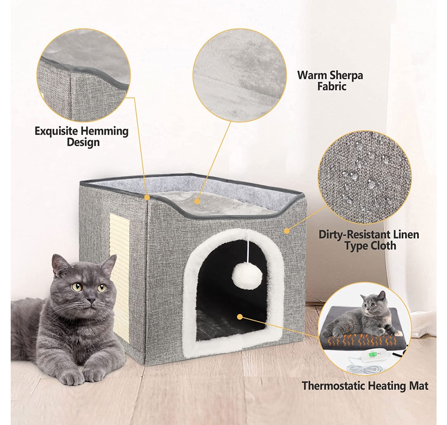 EASY TO FOLD & SPACE SAVING: Enclosed cat houses & condos, heated outdoor cat house can be assembled quickly and can be folded into a flat shape for easy storage and travel. This collapsible cat cave bed fits into anywhere in your room. Place it next to your sofa, in your bedroom, or on a cube shelf organizer.